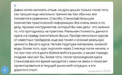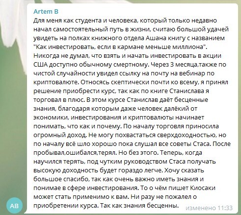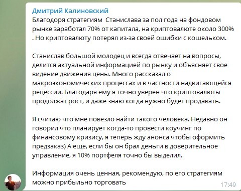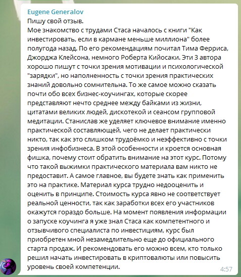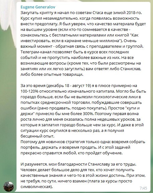 Станислав постоянно старается держать руку на пульсе постоянно изменяющегося мира инвестиций и старается делится актуальными моментами со своими последователями в рамках написанных им обучающих курсов и тренингов «Финансовая свобода с нуля» и «Самый полный коучинг по инвестициям».