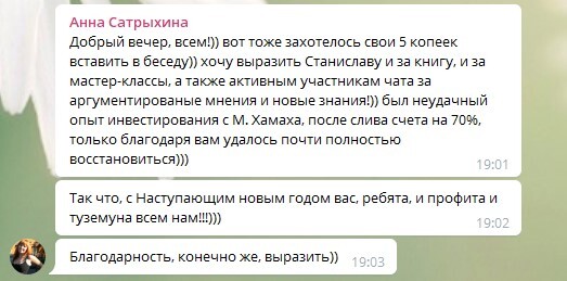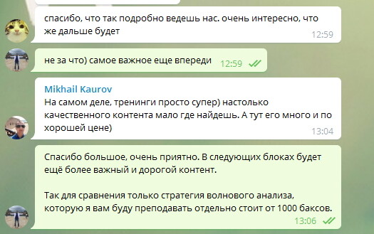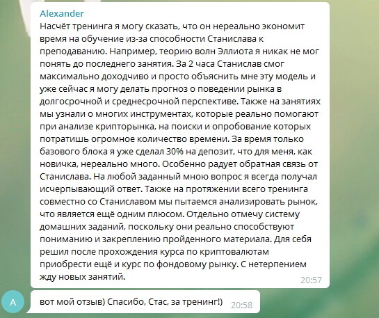 На пакетах выше Silver у вас будет доступ в закрытый Telegram чат, где обсуждается текущая ситуация по рынкам даже после окончания тренинга