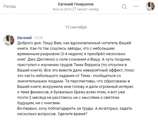 Все дело в том, что я действительно даю реальный и полезный контент. Я не занимаюсь агрессивной продажей и втюхиванием своего коучинга всем подряд в не зависимости от того нужен ли он вам или нет, как делают большинство инфобизнесменов.