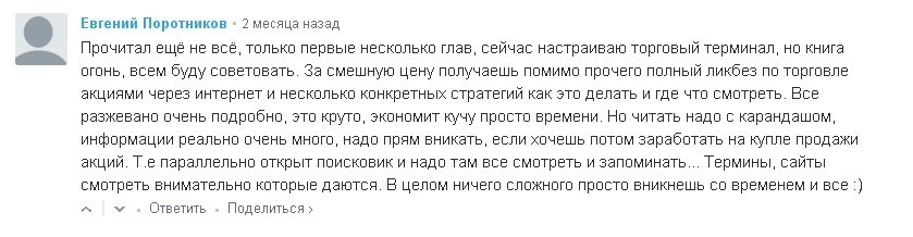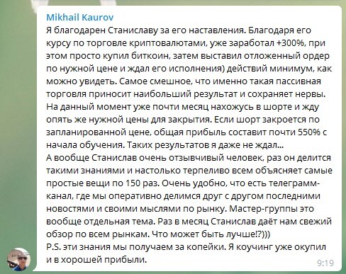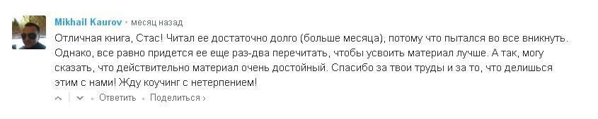 Хороший продукт - это сплав титанических знаний в обязательном порядке проверенных на личном опыте и обкатанных в боевых условиях.Вы сами можете убедиться в том, что без крупных рекламных компаний книга Станислава и его курсы распространяются среди тех, кто в этом действительно нуждается, а значит попадает в итоге именно в те руки,для которых они и были предназначены.